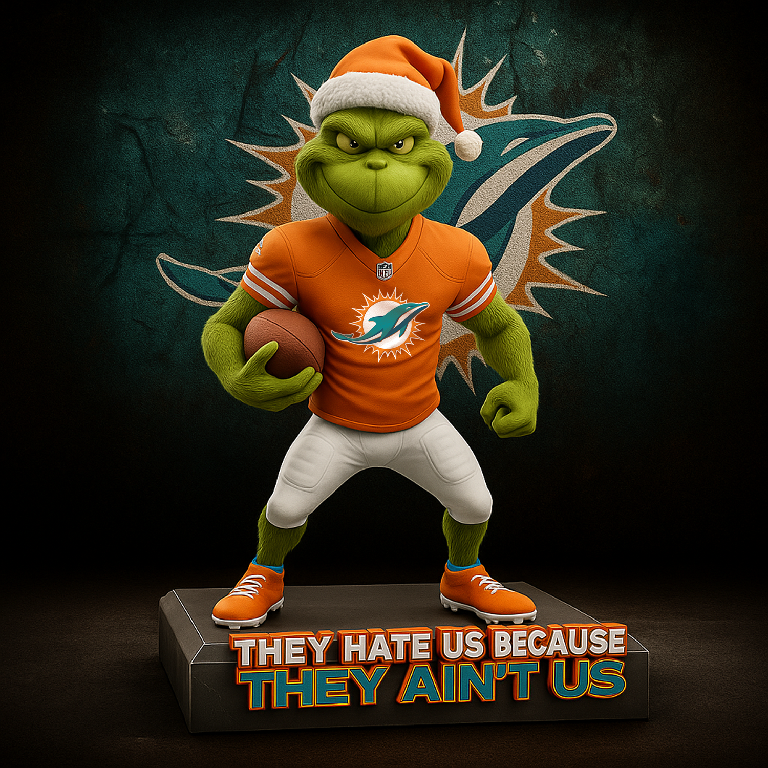 ! Featuring the mischievous Grinch rocking a beanie and jacket, holding a green-and-silver football under glowing holiday lights โ itโs the perfect fusion of Christmas fun and pride.