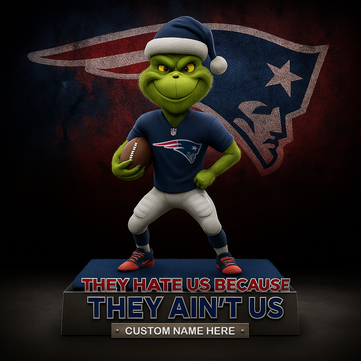 ! Featuring the mischievous Grinch rocking a beanie and jacket, holding a green-and-silver football under glowing holiday lights โ itโs the perfect fusion of Christmas fun and pride.