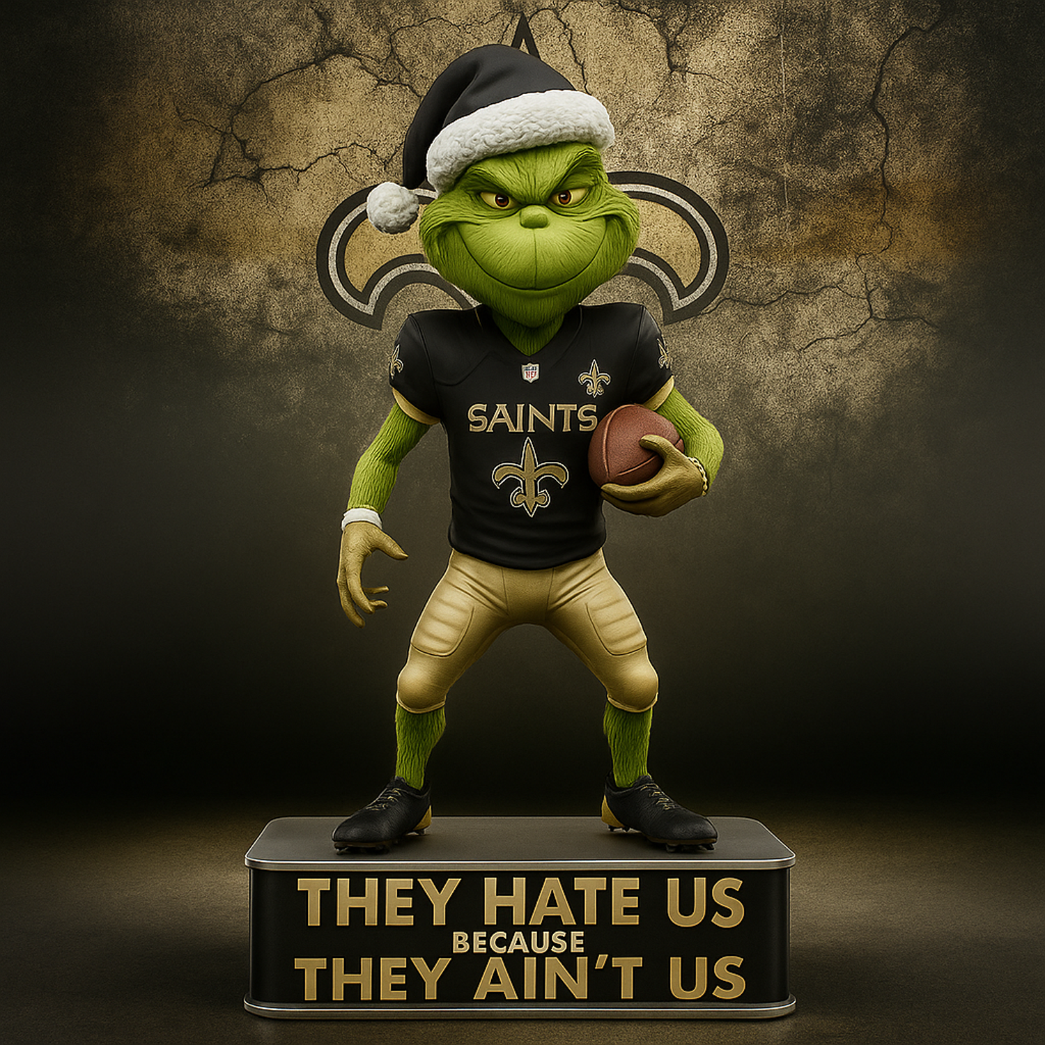 ! Featuring the mischievous Grinch rocking a beanie and jacket, holding a green-and-silver football under glowing holiday lights โ itโs the perfect fusion of Christmas fun and pride.